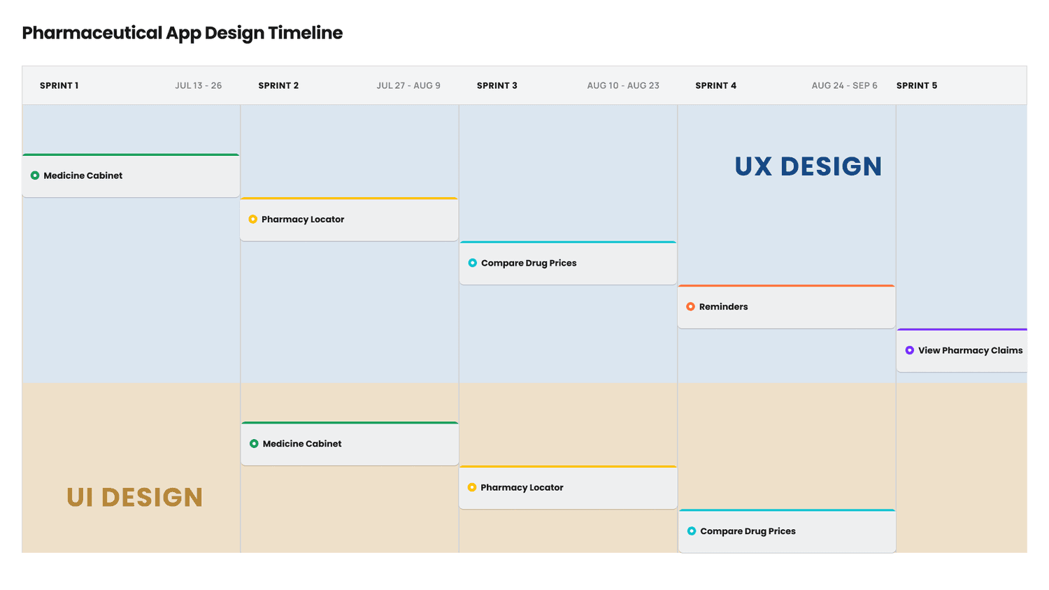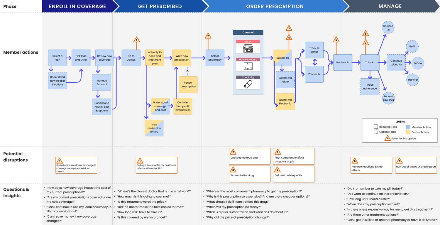 This was my first foray into being a UX design lead for a project, and early on I figured it would be important to define the features of the MVP, as well, as the timeline we would be reviewing and delivering each of them. Working with the principal on the project and a solution architect (A project manager with a little bit more knowledge of a specific industry/subject) we came up with our list of features. This was through a combination of user research conducted by the research team at HCSC as well as a lot of competitive analysis I conducted, looking at competitors' apps, reading reviews/frustrations online about other healthcare providers, and speaking to friends and family about their private health insurance Rx. We also looked at the lifecycle of a prescription for a patient and created a service blueprint that would help us focus on any frustrations or key touch points that the patient may face.