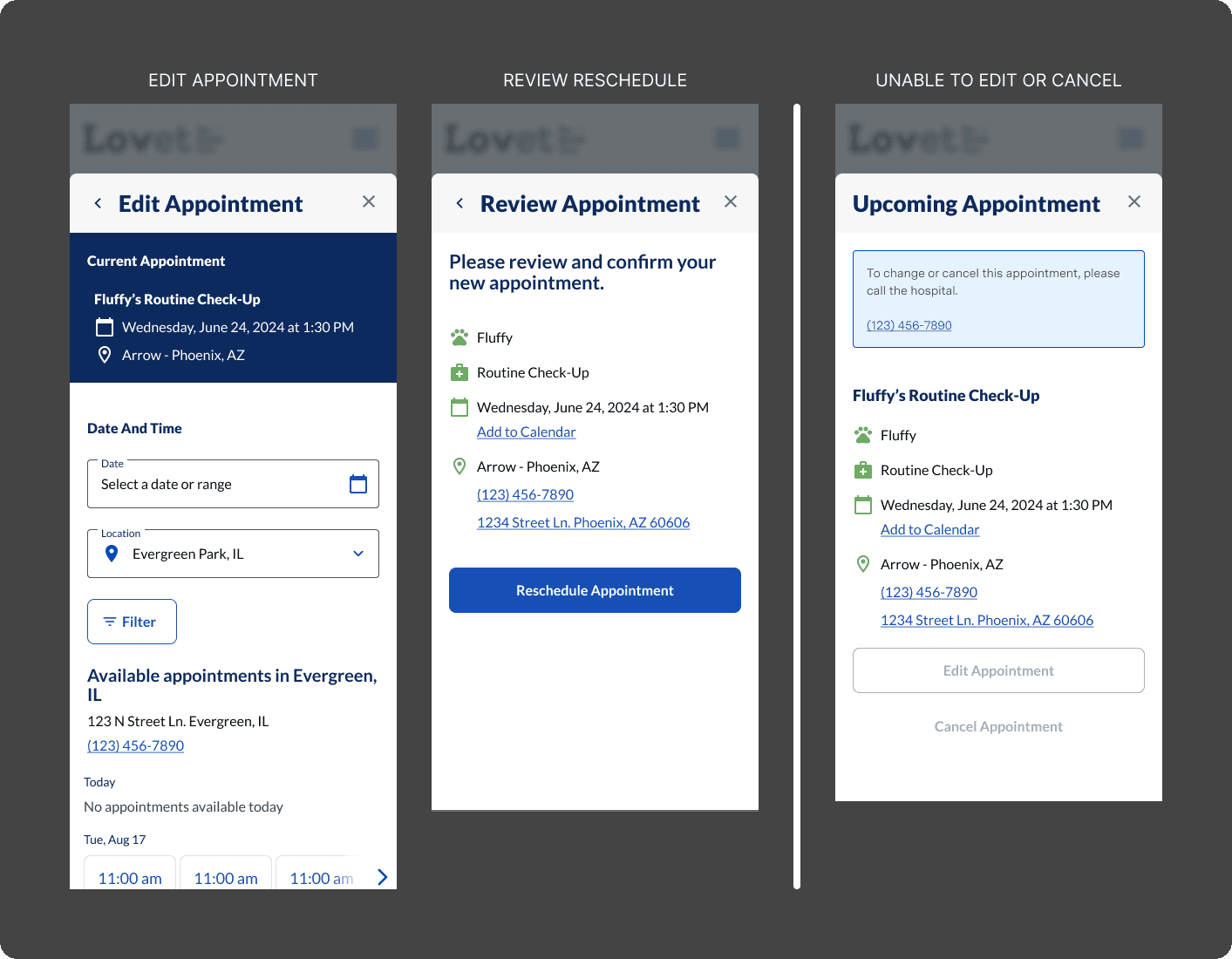 (Note: Clients can call to reschedule appointments that are outside the limits, those being: surgery, vaccine booster, tech, and groomer)